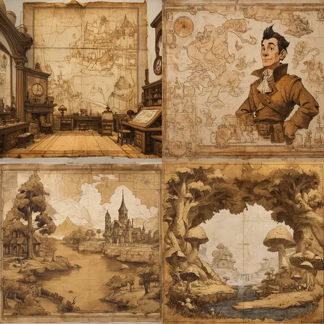 Отличительный стиль, который характеризуется сепиевыми тонами и сложной линейной работой. Это вызывает чувство ностальгии и исторической глубины. Композиции многослойные и детальные, часто включают архитектурные фантазии и причудливые элементы.