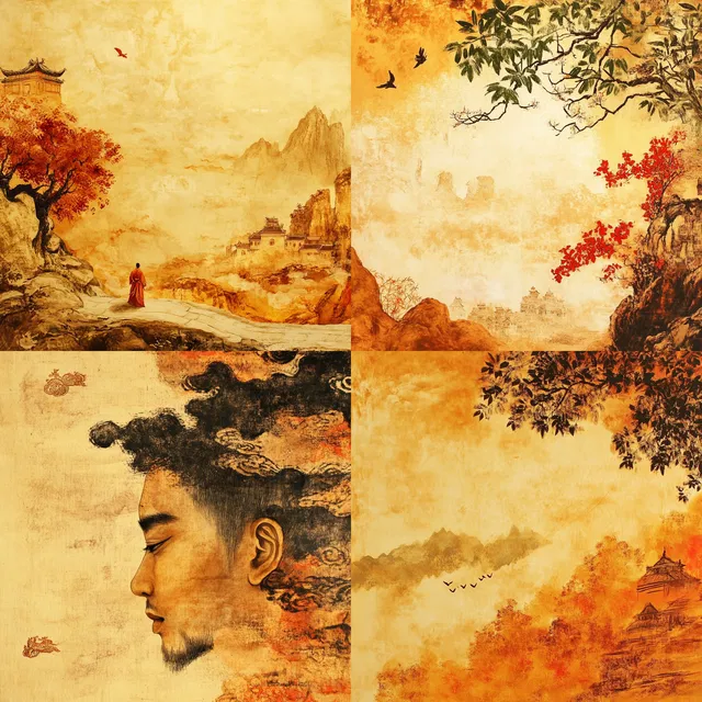 Этот стиль отличается насыщенной текстурой и тёплой палитрой сепии. Он напоминает традиционное азиатское искусство, сочетая культурные мотивы с живописным исполнением. Многослойные композиции и детальная проработка мазков создают ощущение глубины и повествовательности, органично интегрируя органические формы и плавную динамику.