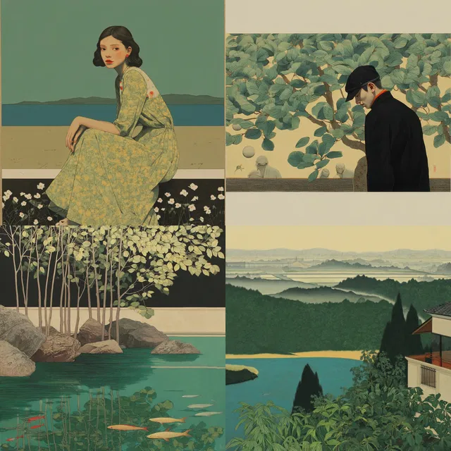 Этот стиль представляет собой гармоничное сочетание традиционной японской эстетики с современными элементами. Для него характерны приглушённые цветовые палитры и безмятежные композиции.