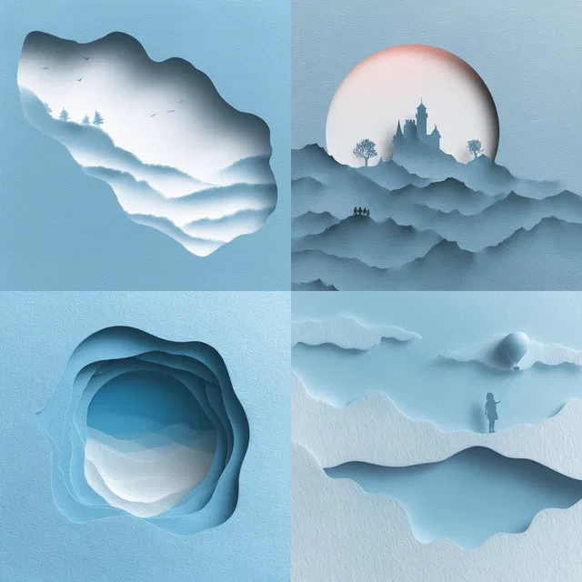 Использование монохромного синего цвета создаёт безмятежную и спокойную атмосферу, усиливая неземные и сказочные качества композиций. Стиль превосходно передаёт ощущение глубины и рельефа, напоминая вырезки из бумаги и скульптурные формы.