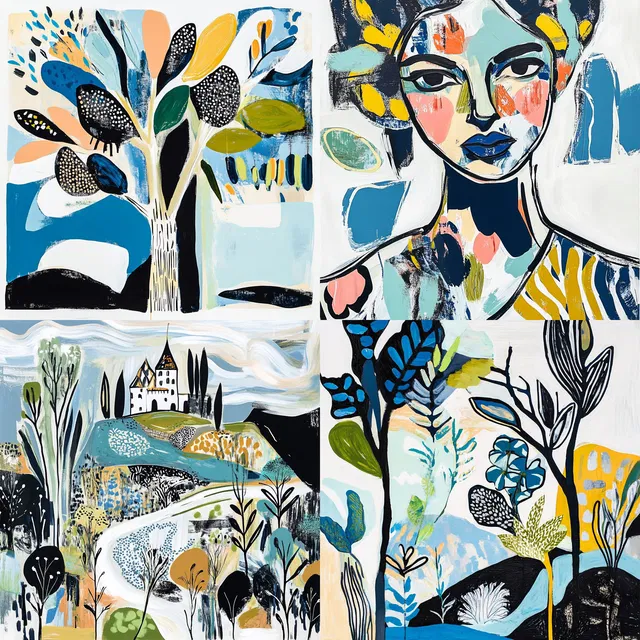 Выразительная манера письма кистью и смелые контуры определяют этот стиль, создавая яркие контрасты и динамичные композиции. Многослойные текстуры и абстрактные формы вызывают ощущение игривой энергии и причудливого шарма. Органичные формы и природные мотивы гармонично сочетаются, отражая влияние модернизма с нотками абстрактного экспрессионизма и фовизма.