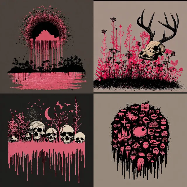 В этом стиле преобладают выразительные силуэты с использованием высокого контраста и ограниченной чёрно-розовой палитры для создания ярких визуальных историй. Эффект капания и брызг добавляет грубую урбанистическую нотку, напоминающую о стрит-арте и граффити.