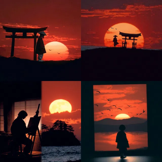 В композициях преобладает силуэтный стиль с акцентом на атмосферную глубину и тёплые цветовые палитры. Этот стиль отличается умением создавать драматические сцены за счёт игры света и тени, часто вызывая чувство ностальгии и сентиментальности. Постоянно используются техники работы с силуэтами и контурами, что усиливает настроение и эмоциональную насыщенность каждого произведения.