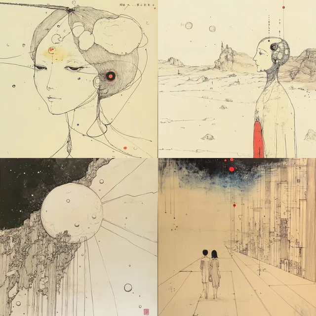 Композиции часто лаконичны, в них основное внимание уделяется взаимодействию пространства и формы, что создаёт ощущение спокойствия и созерцательности. Этот подход прекрасно подходит для передачи футуристических и концептуальных тем, предлагая мечтательный взгляд на гипотетические миры.