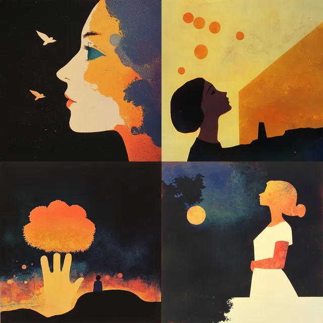 Очаровывающая игра силуэта и тени определяет этот стиль, создавая неземную и загадочную атмосферу. Использование тёплых тонов и мягких оттенков придаёт изображению сказочное качество, а геометрическая абстракция и игра с формами способствуют созданию минималистичного образа.