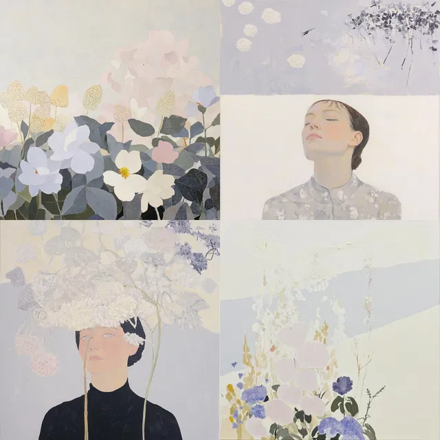 Доминируют пастельные тона и мягкие текстуры, которые создают безмятежную и сказочную атмосферу. Стиль отличается утончённой элегантностью и неземным присутствием, с плавными переходами и минималистичными композициями. Он прекрасно подходит для редакционного дизайна и модной иллюстрации, хотя в некоторых контекстах может не хватать фотореализма. Его сильная сторона — в передаче спокойствия и мечтательных состояний, что делает его идеальным для применений, требующих нежной и изысканной эстетики.