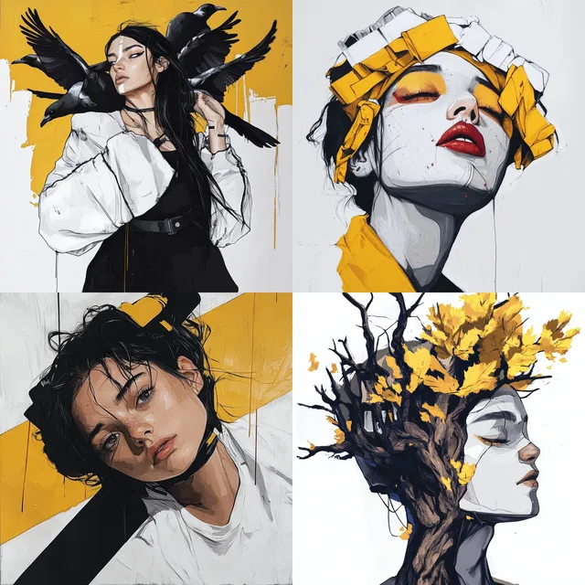 Этот стиль отличается яркой выразительностью и динамичной энергией. Он завораживает смелым использованием цвета и эффектными композициями. Контрастное взаимодействие жёлтого и чёрного цветов создаёт выразительное визуальное впечатление. Многослойные текстуры и замысловатые детали добавляют глубину и сложность.
