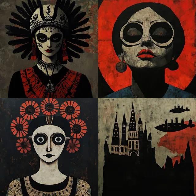 Этот стиль отличается яркостью и выразительностью. Он использует монохромную палитру с яркими красными акцентами, что вызывает ощущение тайны и символизма.