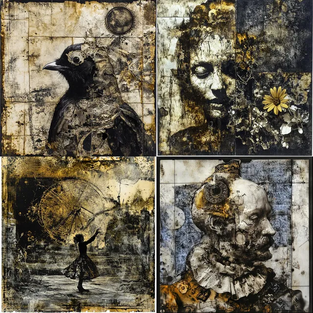 Этот стиль — очаровательное сочетание сюрреализма и стимпанка. Его отличает текстурная глубина и винтажная эстетика. Тоны сепии и изношенные текстуры создают ностальгическую атмосферу, а замысловатые детали и многослойные композиции вызывают ощущение чего-то сказочного. В этом стиле часто встречаются сюрреалистические образы и символические сюжеты, вдохновлённые Викторианской эпохой и промышленной революцией.
