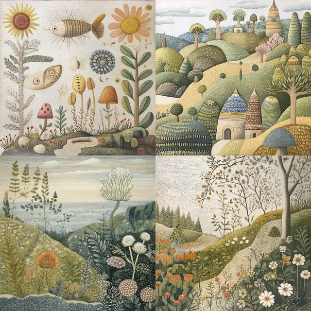 Этот стиль, полный причудливости и очарования, передаёт суть наивного искусства благодаря своим игривым элементам и органичным формам. Мягкая цветовая палитра и детальные текстуры создают сказочную атмосферу, напоминающую иллюстрации из книг.