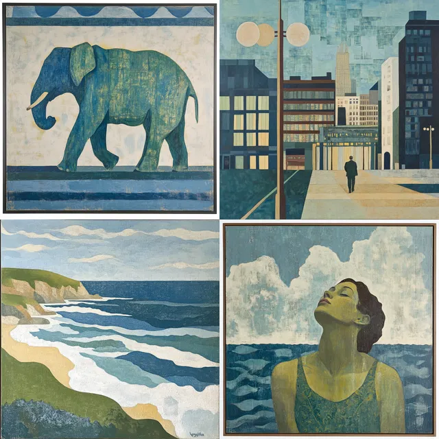 Многослойные композиции и повторяющиеся мотивы указывают на сильное влияние прецизионизма и живописи на американскую тематику. Однако приглушённая цветовая палитра может ограничивать воздействие этого стиля в более ярких или динамичных контекстах.