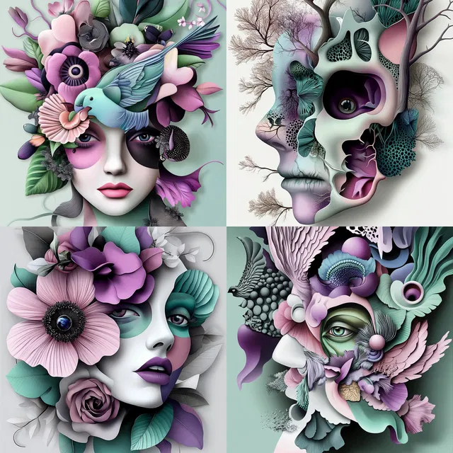 Сюрреализм переплетается с ар-нуво в завораживающем танце пастельных оттенков и органических форм. Этот стиль отличается умением создавать сказочные образы, в которых причудливые детали и чарующие визуальные элементы переносят зрителей в волшебные миры. Его художественную сущность определяют сложные наложения слоёв и динамичные композиции, а мягкие градиенты и приглушённые цвета усиливают сюрреалистичность.