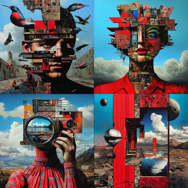 Этот стиль — яркое исследование сюрреализма и коллажа. Он объединяет фрагментарные изображения с насыщенными цветами и динамичными композициями. Техника создания коллажей из разнородных фрагментов формирует многослойный, фактурный эффект, напоминающий кубизм и дадаизм.