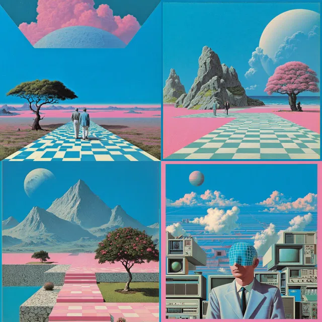 Смело и необычно — этот стиль завораживает благодаря яркому сочетанию розового и синего цветов, создавая сказочные пейзажи и атмосферу нереальности. Геометрические формы и мотивы шахматной доски придают ощущение точности и симметрии, в то время как сюрреалистичные персонажи и причудливые элементы вызывают чувство фантазийного удивления. Тщательная проработка деталей и симметричная точность подчёркивают сюрреалистические корни этого стиля, напоминая работы Магритта и Дали. Однако сосредоточенность стиля на сюрреализме может ограничить его применение в более реалистичных или традиционных контекстах. Он идеально подходит для инсталляций и визуального повествования, превосходно справляясь с созданием сказочных и причудливых историй.