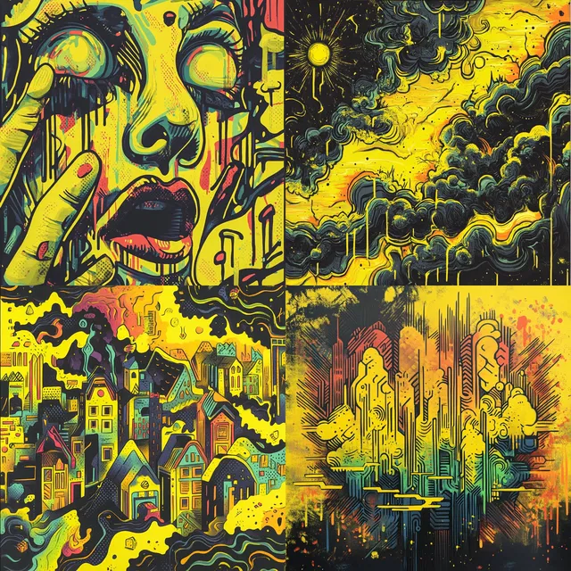 Яркий урбанистический сюрреализм завораживает своими смелыми контурами и насыщенной цветовой палитрой, создавая динамичное взаимодействие выразительной манеры письма и сюрреалистичных элементов. Графическое акцентирование и геометрические узоры придают этому стилю структурированность и живость, напоминая поп-арт и неоэкспрессионизм.
