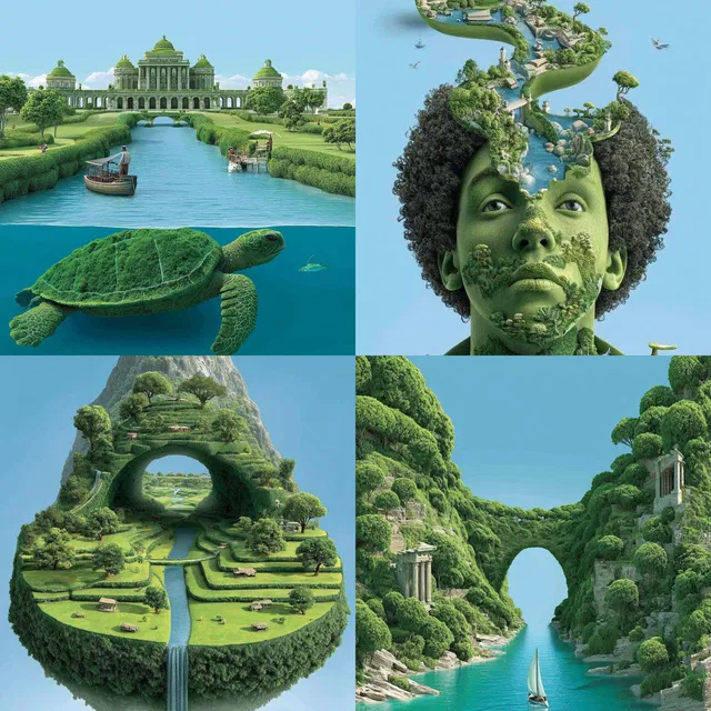 Сине-зелёная палитра и зелёные пейзажи формируют сказочную, причудливую атмосферу. Детальные текстуры и замысловатые узоры вызывают ощущение игривой фантазии. Интеграция природных и структурных мотивов намекает на симбиотические отношения с окружающей средой.
