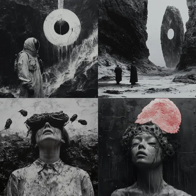 Преобладает мрачный сюрреализм с использованием монохромной палитры, которая усиливает жуткую и сказочную атмосферу. Текстурная сложность и скульптурные формы создают ощущение тактильности, а эмоциональная глубина стиля и повествовательный символизм вызывают ощущение мифа и легенды.