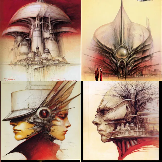Сюрреализм и футуризм сливаются в визуально захватывающем стиле, который отличается сложной линейной работой, органическими формами и механическими элементами. Использование тонов сепии и красных акцентов придаёт произведениям мечтательную, атмосферную окраску.