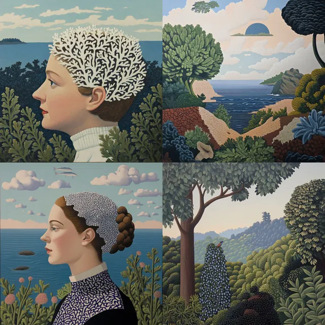 Этот стиль сочетает детальные текстуры с приглушёнными тонами, создавая сюрреалистичный и сказочный мир, который одновременно кажется знакомым и потусторонним. Использование многослойной глубины и геометрической точности придаёт каждому произведению структурированность и органичность, напоминая традиции сюрреализма и магического реализма.