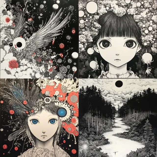 На изображениях можно увидеть как мифических существ, так и футуристические городские пейзажи. Всё это исполнено с причудливым и творческим подходом.