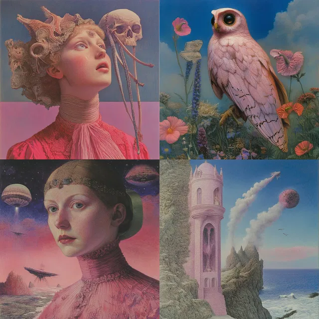 Сюрреализм пронизывает этот стиль, для которого характерны сказочные, эфемерные качества и причудливая, потусторонняя атмосфера. Замысловатые текстуры и детализированные композиции создают сложное визуальное повествование, часто напоминающее работы таких художников, как Макс Эрнст и Сальвадор Дали. Мягкая пастельная цветовая палитра усиливает сюрреалистическое и эфемерное настроение, что делает этот стиль идеальным для обложек книг, редакционных иллюстраций и концепт-арта. Однако его сильные стороны в области сюрреализма могут ограничивать эффективность в фотореалистичных или высокотехнических контекстах.