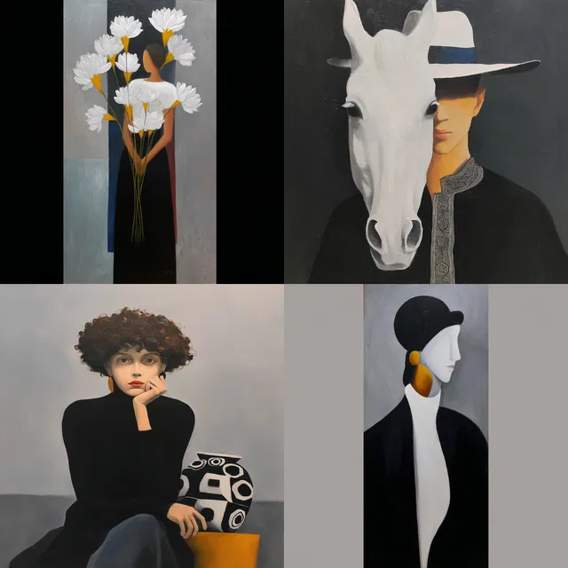 В этом стиле доминируют сюрреалистическая абстракция и минималистичное выражение. Его отличает наличие безличных фигур и геометрическая точность. Приглушённая цветовая палитра и мягкие градиенты создают сдержанную, но элегантную атмосферу. Использование монолитных форм и органических очертаний отражает влияние модернизма.