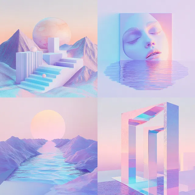 Этот стиль определяют пастельные градиенты и призрачное освещение, которые создают сказочную и сюрреалистичную атмосферу. Мягкие переходы и отражающие поверхности усиливают визуальное повествование, предлагая неземной опыт.