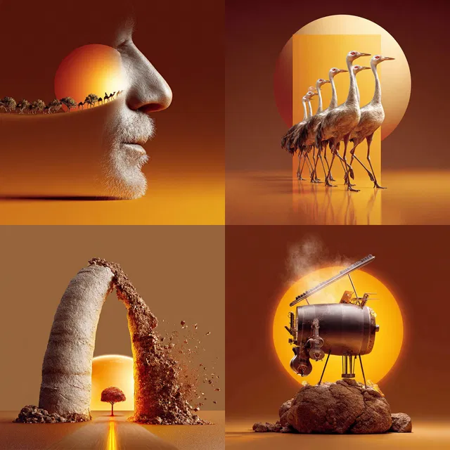 Этот стиль завораживает удивительным сочетанием сюрреализма и символизма. Он очаровывает тёплыми тонами сепии и сказочной атмосферой. Замысловатые текстуры и новаторское использование света создают насыщенное, многослойное визуальное впечатление, а круглые мотивы и сияющие центры притягивают взгляд.