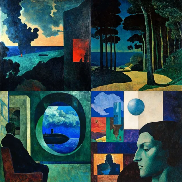 Сюрреалистические геометрические пейзажи сочетают в себе эфемерные, сказочные качества со структурированными геометрическими формами, создавая уникальное визуальное повествование. В этом стиле используются приглушённые цвета и символичные образы, часто включающие архитектурные элементы и человеческие фигуры в сюрреалистических композициях. Под влиянием сюрреализма и модернизма этот стиль исследует темы экзистенциализма и человеческого состояния.