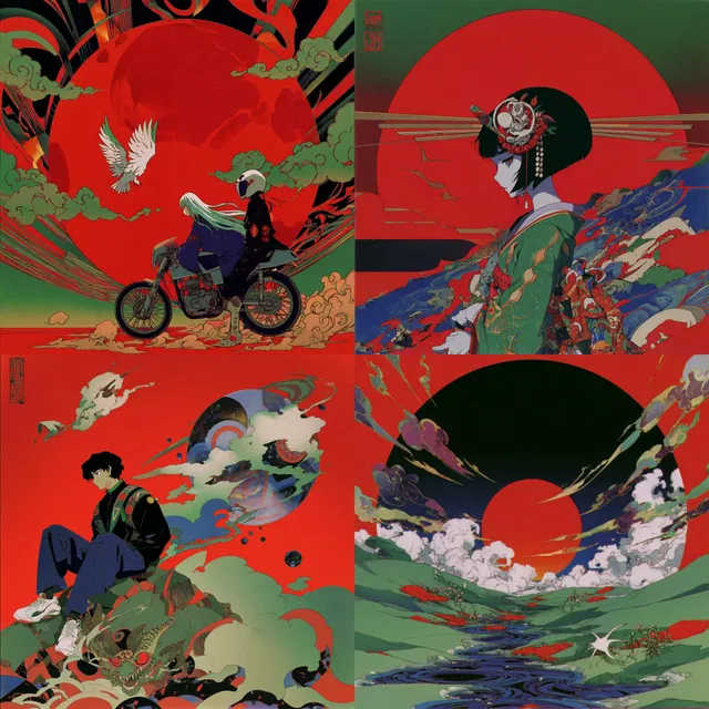 Этот стиль — поразительное сочетание эстетики японской укиё-э и современного сюрреализма. Он очаровывает смелыми цветовыми контрастами и сложной прорисовкой линий. Ярко-красные, сочные зелёные и глубокие синие оттенки создают динамичную визуальную картину. Выразительные персонажи и сюрреалистичные пейзажи рождают атмосферу сновидений.