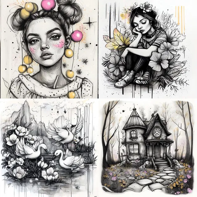 Причудливый графический сюрреализм отличается игривым, но сложным подходом, сочетающим иллюстративные и эскизные элементы с влиянием сюрреализма. Для стиля характерны плавные линии, высокая контрастность и минималистичные, но детализированные композиции. Монохромные палитры часто дополняются яркими цветовыми акцентами, что создаёт динамичное визуальное повествование.