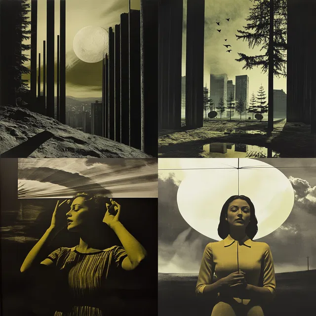 Кинематографическое освещение и драматичные тени усиливают неземную атмосферу, создавая ощущение потустороннего мира. Последовательное использование элементов ретрофутуризма и сюрреалистических декораций в разных примерах подчёркивает сильное визуальное повествование.