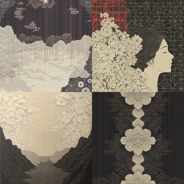 Монохромная палитра и тонкие текстуры создают спокойную атмосферу, а детальные узоры и культурные мотивы добавляют глубины и сложности.