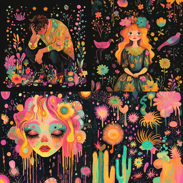 Яркие цвета и причудливые композиции создают сюрреалистичную и сказочную атмосферу. В этом стиле чувствуется игривое изобилие: используются органические формы и плавные очертания, что напоминает влияние психоделического и поп-сюрреализма.