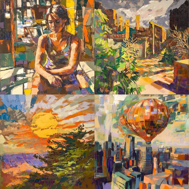 Этот стиль отличается яркостью и динамичностью. Он создаёт мозаичную текстуру, объединяя разные темы: от футуристических пейзажей до редакционных иллюстраций. Он прекрасно справляется с созданием красочного и разнообразного визуального повествования. Благодаря богатому живописному подходу, этот стиль выделяется, но иногда ему не удаётся достичь фотореализма, особенно в фотографических контекстах.