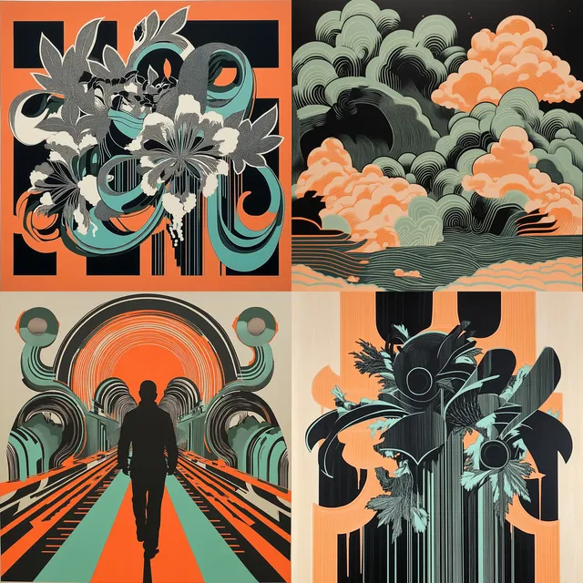 Этот яркий и динамичный стиль характеризуется смелым использованием геометрической абстракции и высококонтрастных цветовых палитр, в которых преобладают бирюзовый и оранжевый цвета. В нём прослеживается влияние оп-арта и арт-деко с акцентом на структурированные формы и графическую детализацию.