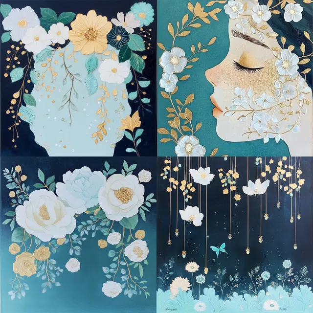Этот стиль отличается богатыми деталями и затейливыми украшениями. В нём гармонично сочетаются бирюзовые и золотые оттенки. Композиции насыщены цветочными мотивами и растительными элементами, что создаёт спокойную и воздушную атмосферу.