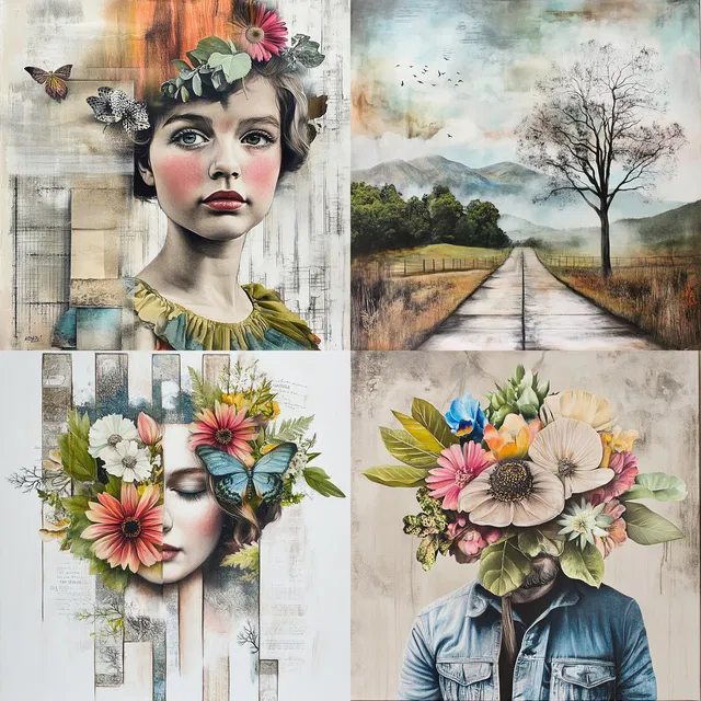 Многослойные текстуры и техники смешанной техники определяют этот стиль, создавая богатую палитру визуальной глубины и сложности. Пастельные тона и приглушённые цвета гармонично сочетаются, вызывая ностальгическую и мечтательную атмосферу.