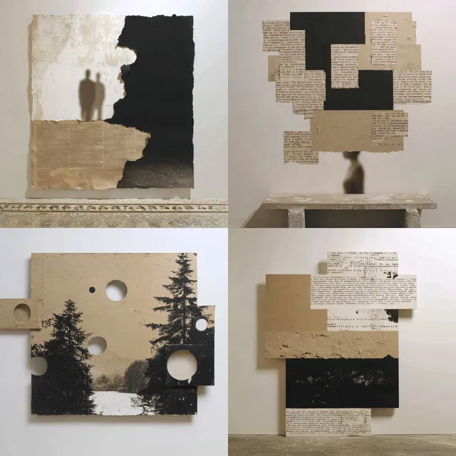 Этот стиль отличается эстетикой коллажа и создаёт многослойные текстурные композиции, которые вызывают ощущение фрагментарной реальности. Использование монохромных и приглушённых тонов усиливает спокойное, созерцательное настроение, а рваные края и грубые текстуры придают органичность и ощущение состаренности.