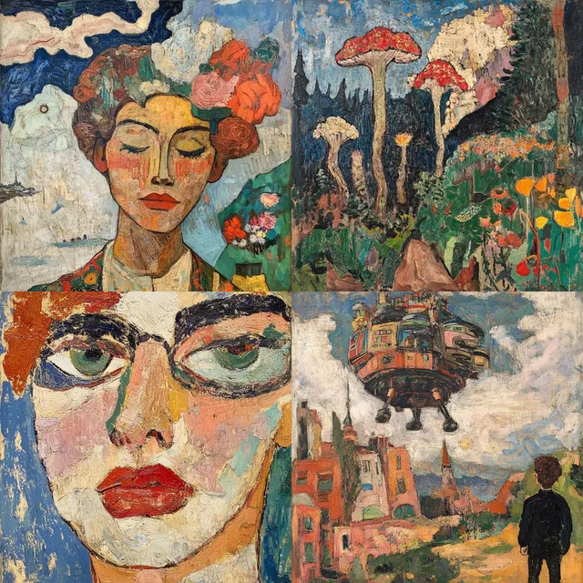 Стиль «Яркий текстурный экспрессионизм» демонстрирует динамичное взаимодействие цвета и текстуры, напоминая о влиянии постимпрессионизма и фовизма. В этом стиле используется насыщенная живописная манера письма и многослойные композиции для создания выразительных и сюрреалистичных образов.