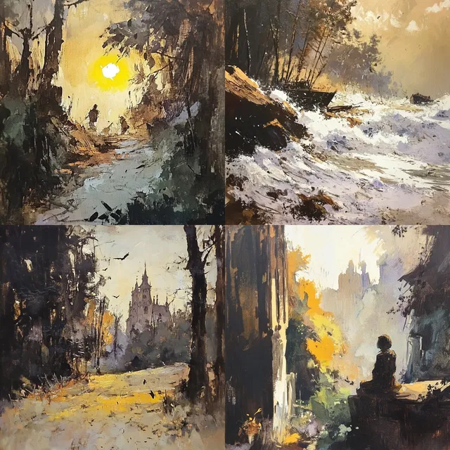 Этот стиль отличается насыщенной текстурой и атмосферой. Он прекрасно передаёт игру света и тени, вызывая чувство ностальгии и глубины. Его живописный подход, характеризующийся выразительной манерой письма кистью и многослойными текстурами, придаёт каждому произведению динамичность и эмоциональность.