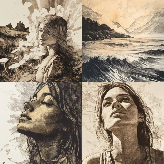 Этот стиль отличается выразительными линиями и глубиной текстуры. В нём органично сочетаются природные мотивы и элементы, вдохновлённые природой. Тёплые, ностальгические оттенки сепии и землистых тонов создают гармоничную палитру, напоминающую об искусстве модерн и романтизме. Замысловатые детали и композиции вызывают ощущение спокойствия и сказочной атмосферы.