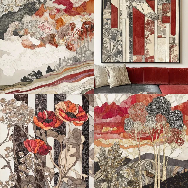 Сложный линейный рисунок и текстурированные слои определяют этот стиль, напоминающий модерн с его органическими узорами и сложными компоновками. Приглушённая земляная палитра усиливает природные мотивы, создавая гармоничный баланс между природными и урбанистическими элементами.