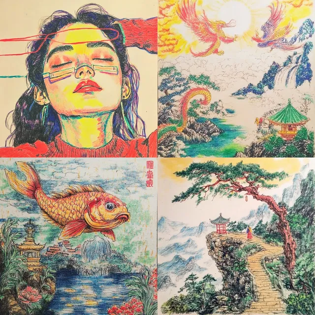 Этот динамичный и фактурный стиль отличается яркими цветовыми палитрами и выразительной линейкой, что напоминает влияние импрессионизма и укиё-э. Ощущение рисунка от руки и многослойность цветов создают оживлённую и энергичную атмосферу в самых разных темах: от футуристической биоархитектуры до причудливых сказок.