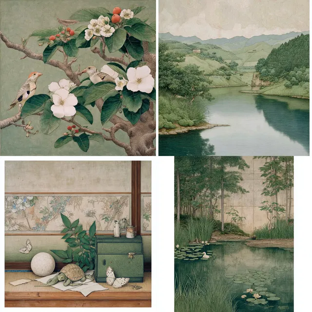Изящные линии и тонкие текстуры определяют этот стиль, напоминая традиционную восточноазиатскую эстетику с современным уклоном. Пастельная палитра и гармоничные композиции создают спокойную атмосферу, сочетая культурные мотивы с элементами, вдохновлёнными природой. Замысловатые детали и мягкие оттенки усиливают безмятежное настроение.