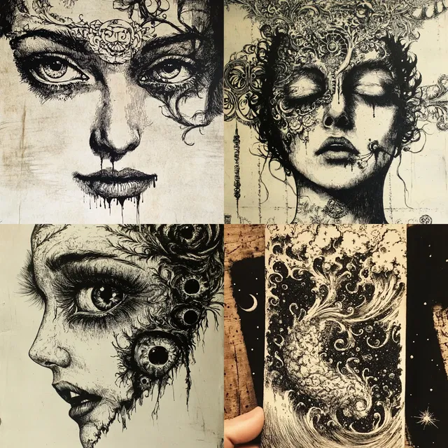 Этот стиль характеризуется сложной линейной работой и глубиной текстуры, которые вызывают ощущение мистики и исторического богатства. В композициях чувствуется влияние готики и викторианской эпохи. Монохромная палитра усиливает драматические контрасты и сложные детали.