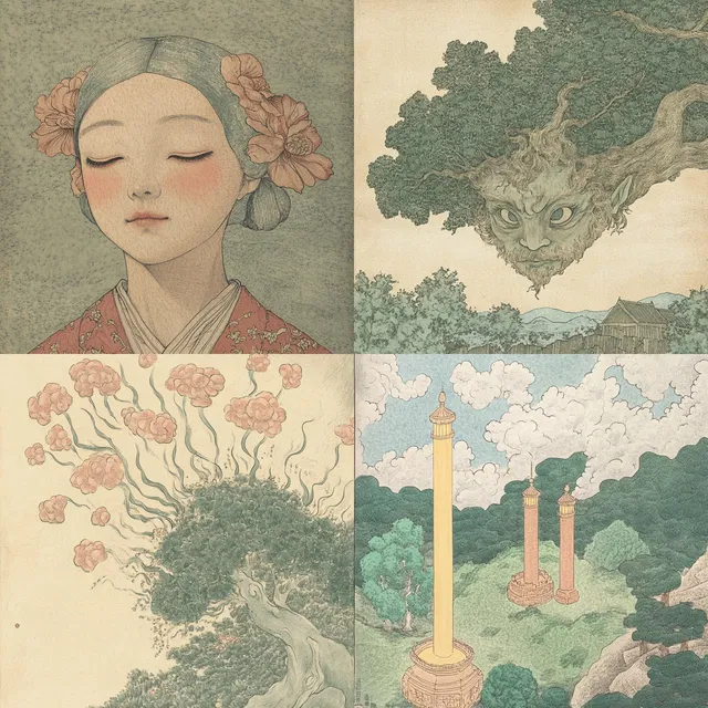 Этот стиль отличается изящными линиями и тонкой проработкой деталей, которые напоминают японские гравюры укиё-э. Нежные текстуры и приглушённые тона создают атмосферу мечтательности. Замысловатые композиции и гармоничное расположение элементов уравновешивают визуальное повествование.