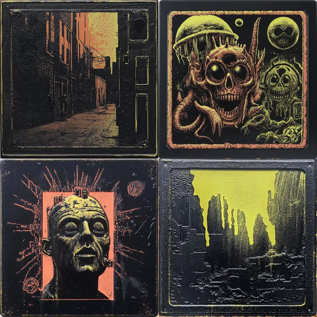 Изображаемые объекты варьируются от городского упадка и механических форм до человеческих фигур и футуристических доспехов. В работах исследуются темы технологической дистопии и городской изоляции.
