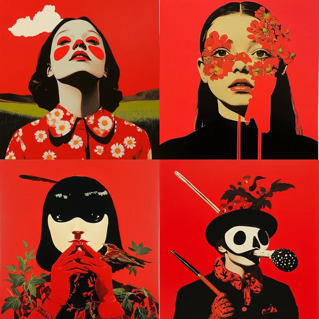 В этом стиле преобладает яркое сочетание красного и чёрного. Он представляет собой сплав смелых влияний поп-арта и элементов сюрреализма, создавая визуально захватывающий эффект. Композиции тщательно продуманы: в них гармонично сочетаются утончённость и смелость. Часто используется резкий контраст, который усиливает эмоциональный заряд изображений.