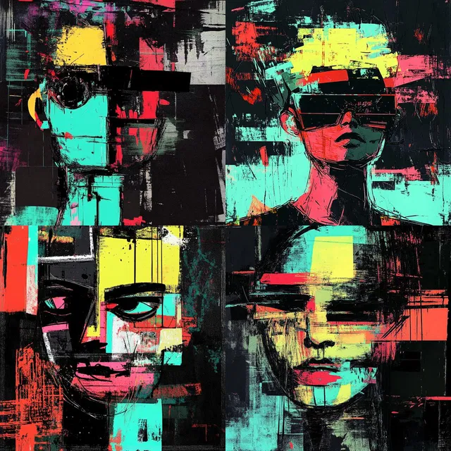 «Vivid Urban Abstraction» демонстрирует смелое взаимодействие геометрических форм и ярких цветов, создавая динамичный и выразительный визуальный язык. В этом стиле используются высококонтрастные, насыщенные оттенки, которые вызывают ощущение энергии и движения, напоминая абстрактный экспрессионизм и кубизм. Фрагментированные и искажённые элементы придают авангардный характер, подчёркивая темы городского упадка и антиутопических пейзажей.